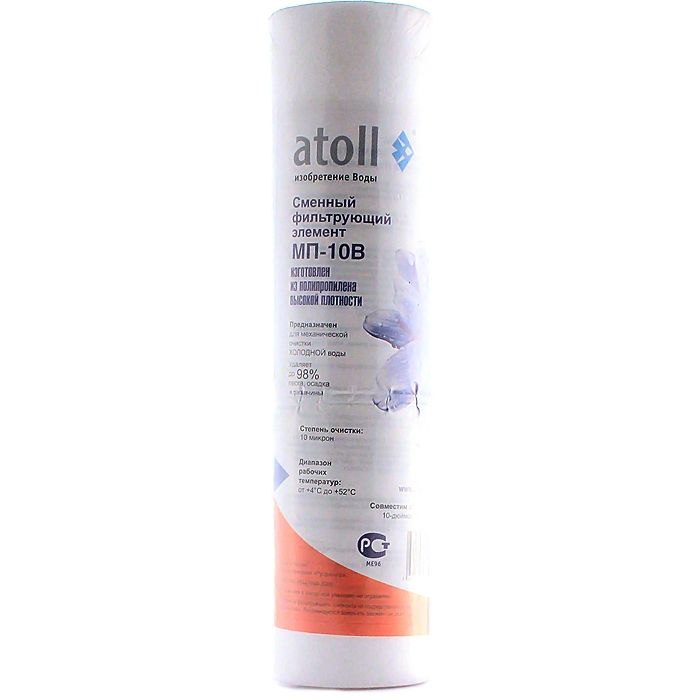 Сменный фильтрующий элемент из вспененного полипропилена Atoll МП-10В. Предназначен для холодной воды, обеспечивает механическую очистку от нерастворимых частиц (песок, глина, ржавчина и пр.)