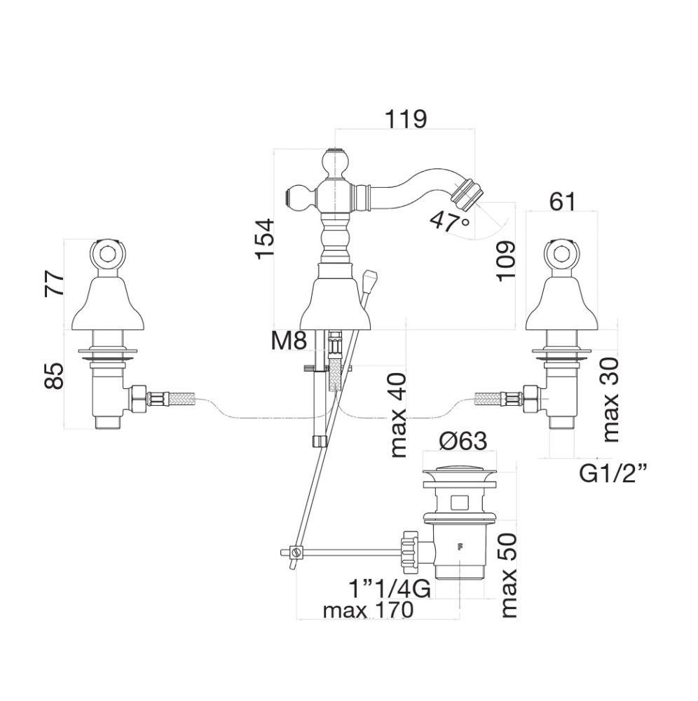 Смеситель для биде на 3 отверстия Fiore с донным клапаном в комплекте.