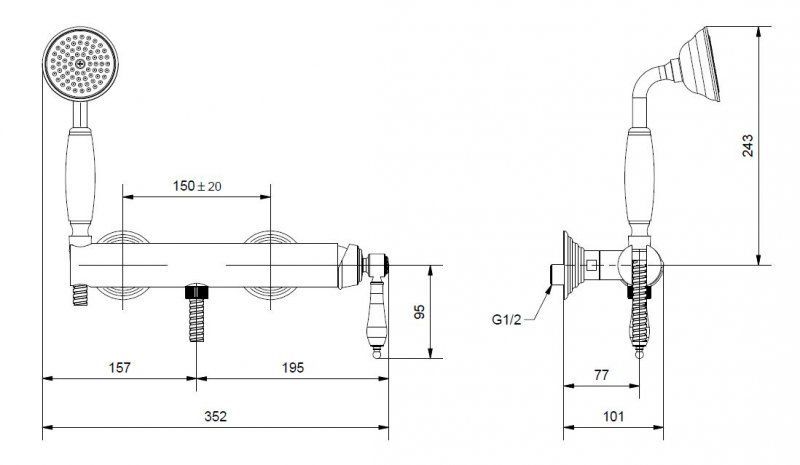 Оснащение: душевой шланг, душевая лейка, держатель, эксцентрики