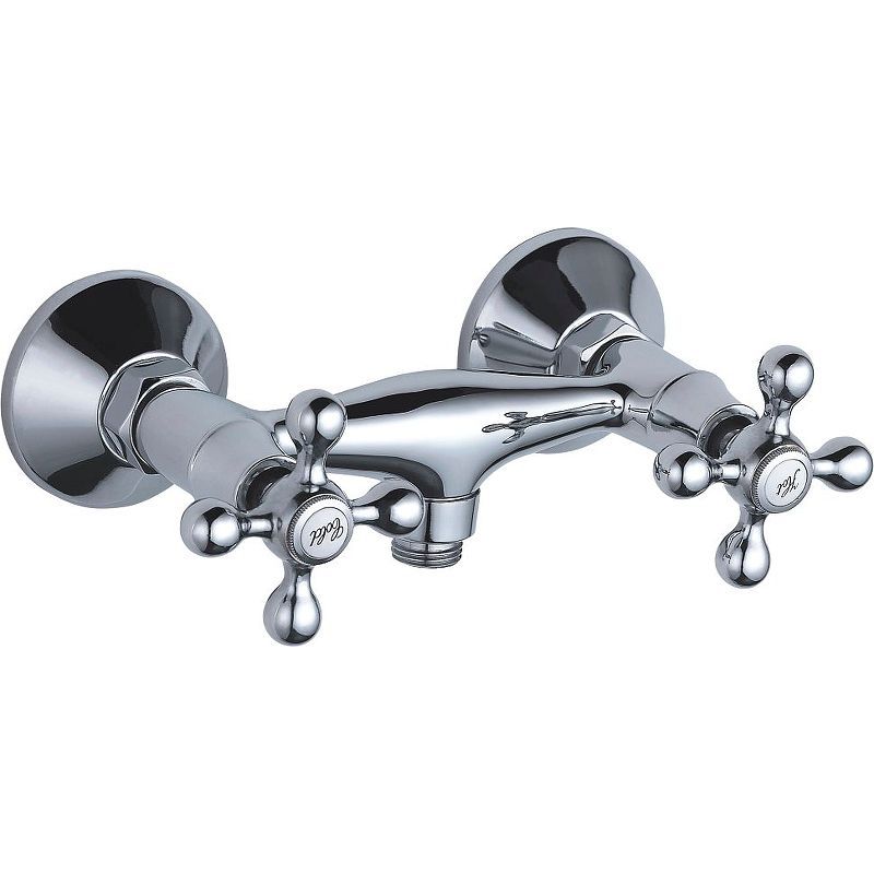 Смеситель изготовлен из металлического сплава. Диаметр декоративных чашек 70 мм. Душевой гарнитур в комплекте. Межосевое расстояние (расстояние между выходом горячей и холодной трубы) 150 мм. Данное расстояние изменяется за счет входящих в комплект эксцентриков на 15 мм. в большую или меньшую стороны. Цвет хром.