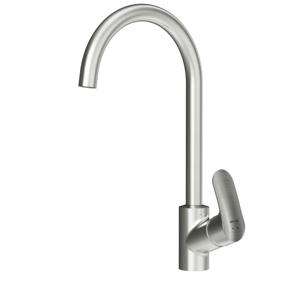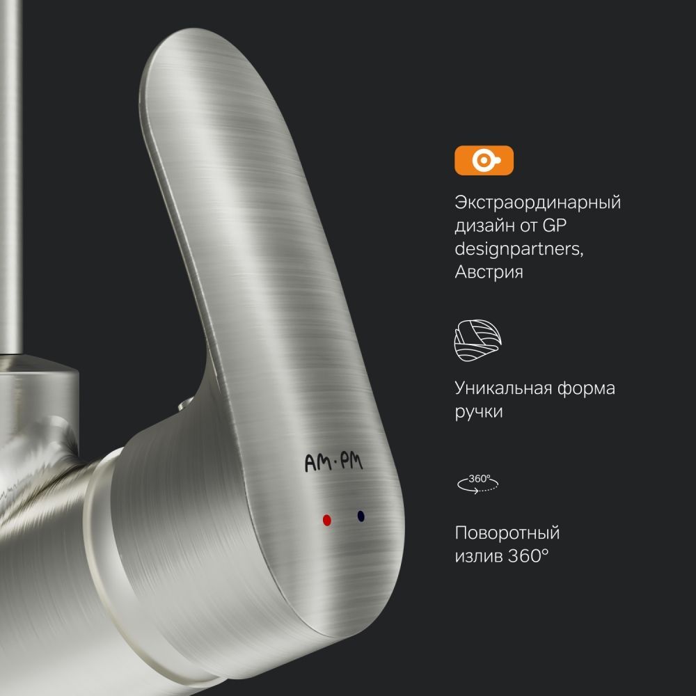Однорычажный смеситель для кухни AM PM Like F8007111 с поворотным изливом. Впервые модный дизайнерский смеситель в доступном сегменте: ультрамодный стиль Dynamic Organic — природные формы в сочетании с четкими линиями, доведенными до совершенства человеком. Максимальный комфорт: плавное вращение поворотного излива в любом направлении обеспечивает непревзойденное удовольствие от использования и удобство в работе на кухне. Эксклюзивная разработка: специально спроектированный для АМ.РМ керамический картридж SoftMotion 35 мм обеспечивает оптимальную регулировку температуры, а также позволяет выдерживать любые перепады давления. Разработан с учетом ваших потребностей и особенностей различных пространств. Высокий излив смесителя Like идеально подойдет для любой раковины поможет вам с легкостью справится с такими задачами, как наполнение больших емкостей. Забота о безопасности: изготовлен из экологичной и безопасной латуни с пониженным содержанием свинца. Надежность на 700 процентов, протестирован на 500000 циклов включения, что в 7 раз превышает европейские стандарты.