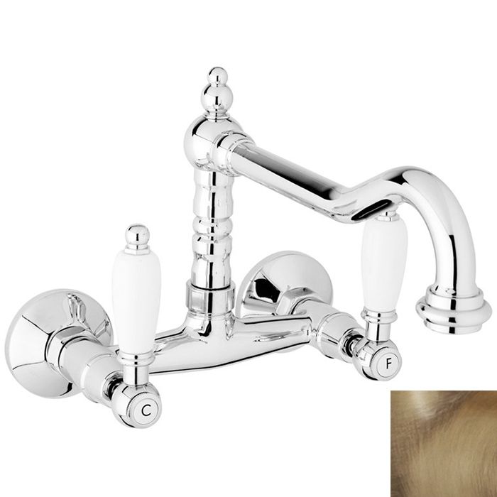 Настенный двухвентильный смеситель с поворотным изливом и аэратором, монтируемый в два отверстия. Имеет долгий срок эксплуатации за счет качественных деталей, неприхотлив в уходе. Станет прекрасным дополнением ванной комнаты в классическом или ретро стиле.