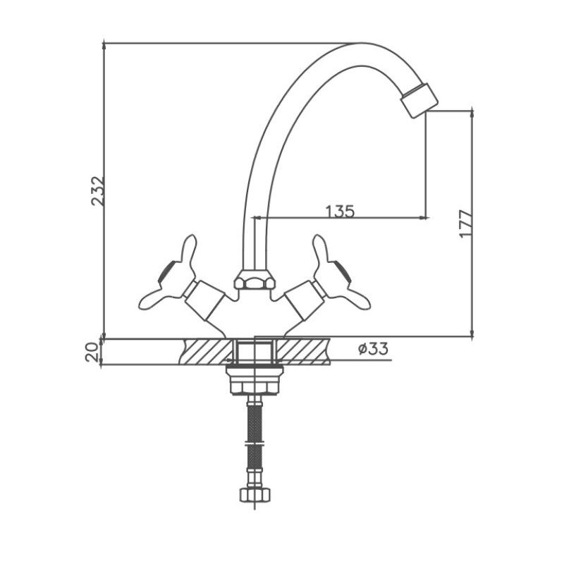 Вентильное управление. Изготовлен из металлического сплава. Максимальная глубина монтажа 20 мм. Монтажное отверстие 33 мм. Поворотный излив. Цвет хром.