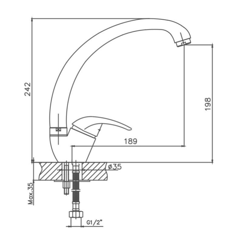 Керамический картридж 40 мм. Изготовлен из металлического сплава. Максимальная глубина монтажа 35 мм. Монтажное отверстие 35 мм. Поворотный излив. Цвет хром.