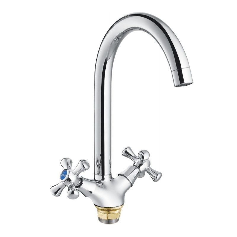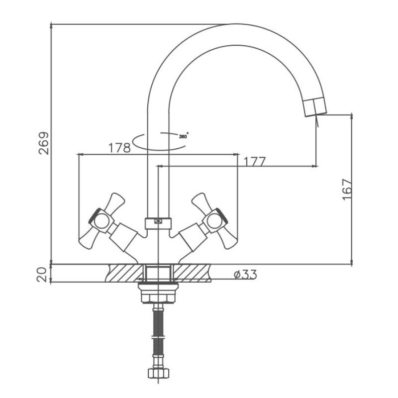 Вентильное управление. Изготовлен из металлического сплава. Максимальная глубина монтажа 20 мм. Монтажное отверстие 33 мм. Поворотный излив. Цвет хром.