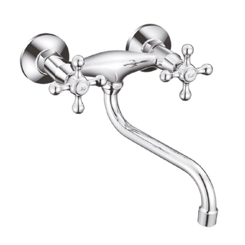 Вентильное управление. Изготовлен из металлического сплава. Межосевое расстояние 150 ± 15 мм. Диаметр декоративных чашек 70 мм. Поворотный излив. Цвет хром.