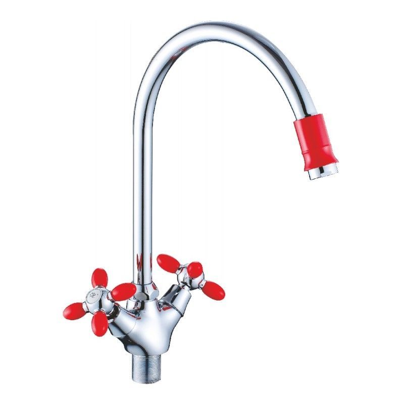 Вентильное управление. Изготовлен из металлического сплава. Максимальная глубина монтажа 25 мм. Монтажное отверстие 33 мм. Поворотный излив. Цвет красный/хром.