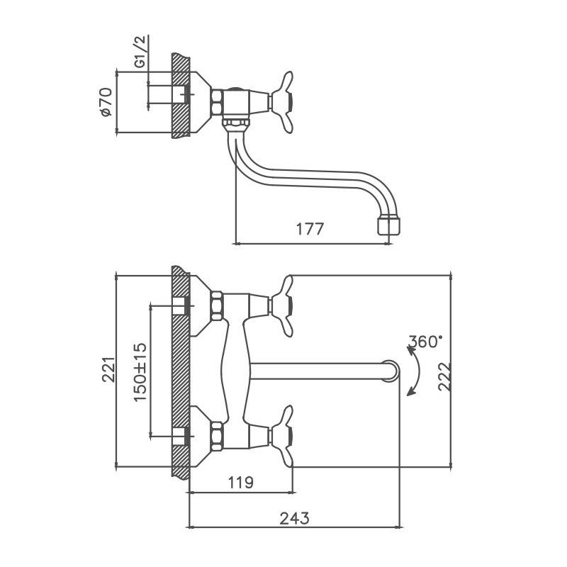 Вентильное управление. Изготовлен из металлического сплава. Межосевое расстояние 150 ± 15 мм. Диаметр декоративных чашек 70 мм. Поворотный излив. Цвет хром.