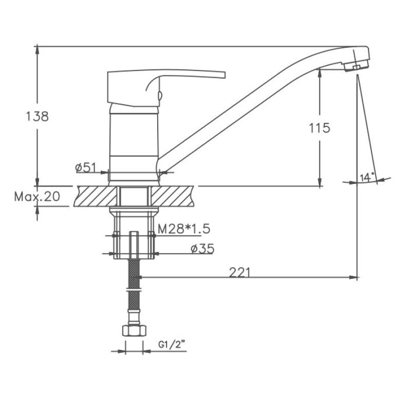 Керамический картридж 40 мм. Изготовлен из металлического сплава. Изменение угла аэратора на 14 градусов. Максимальная глубина монтажа 20 мм. Монтажное отверстие 28 мм. Поворотный излив. Цвет хром.