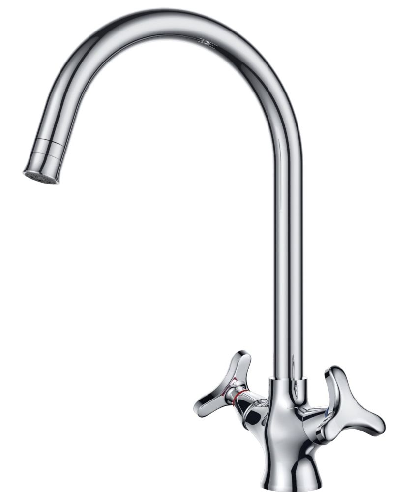 Блестящий внешний вид двухручкового смесителя с обновленными ручками привлекает своим внешним видом, послужит прекрасным дополнением классической кухни.