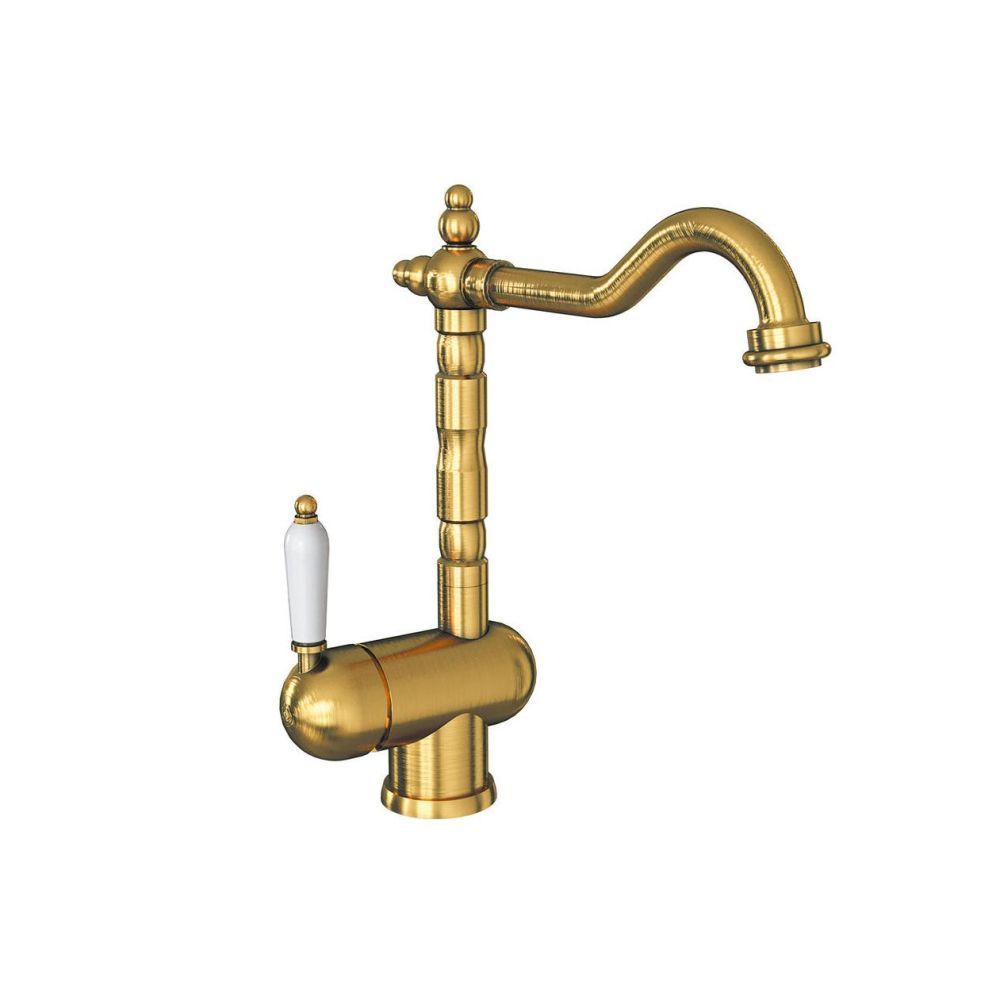 Смеситель однорычажный с высоким изливом. Керамические ручки. Материал - латунь. Поворотный излив. Керамический картридж 40мм. Гибкая подводка.