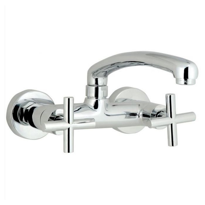 Смеситель с поворотным изливом и двумя вентилями. Монтируется на стену в 2 отверстия. Качественные материалы, которые использовались в производстве смесителя, обеспечивают долговечность и исправную работу на протяжении всего срока службы. Современный дизайн подойдет практически для любого интерьера ванной комнаты. Приятные тактильные ощущения обеспечиваются за счет полированной поверхности смесителя.