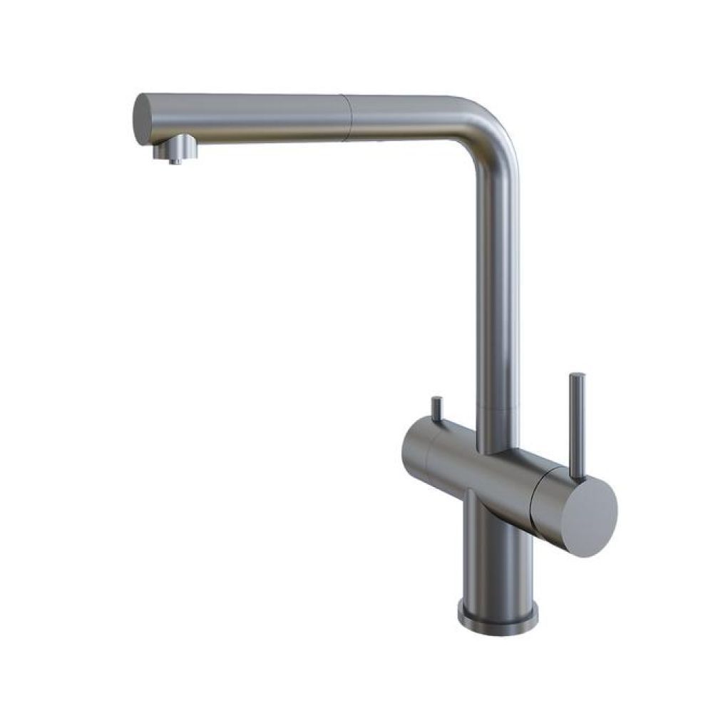 Смеситель GRANDEX AQUA HANDY-P - современный, стильный и многофункциональный кухонный смеситель, выполненный из высококачественной нержавеющей стали. В смесители использованы испанский керамический картридж Sedal 35 мм и швейцарский аэратор Neoperl.