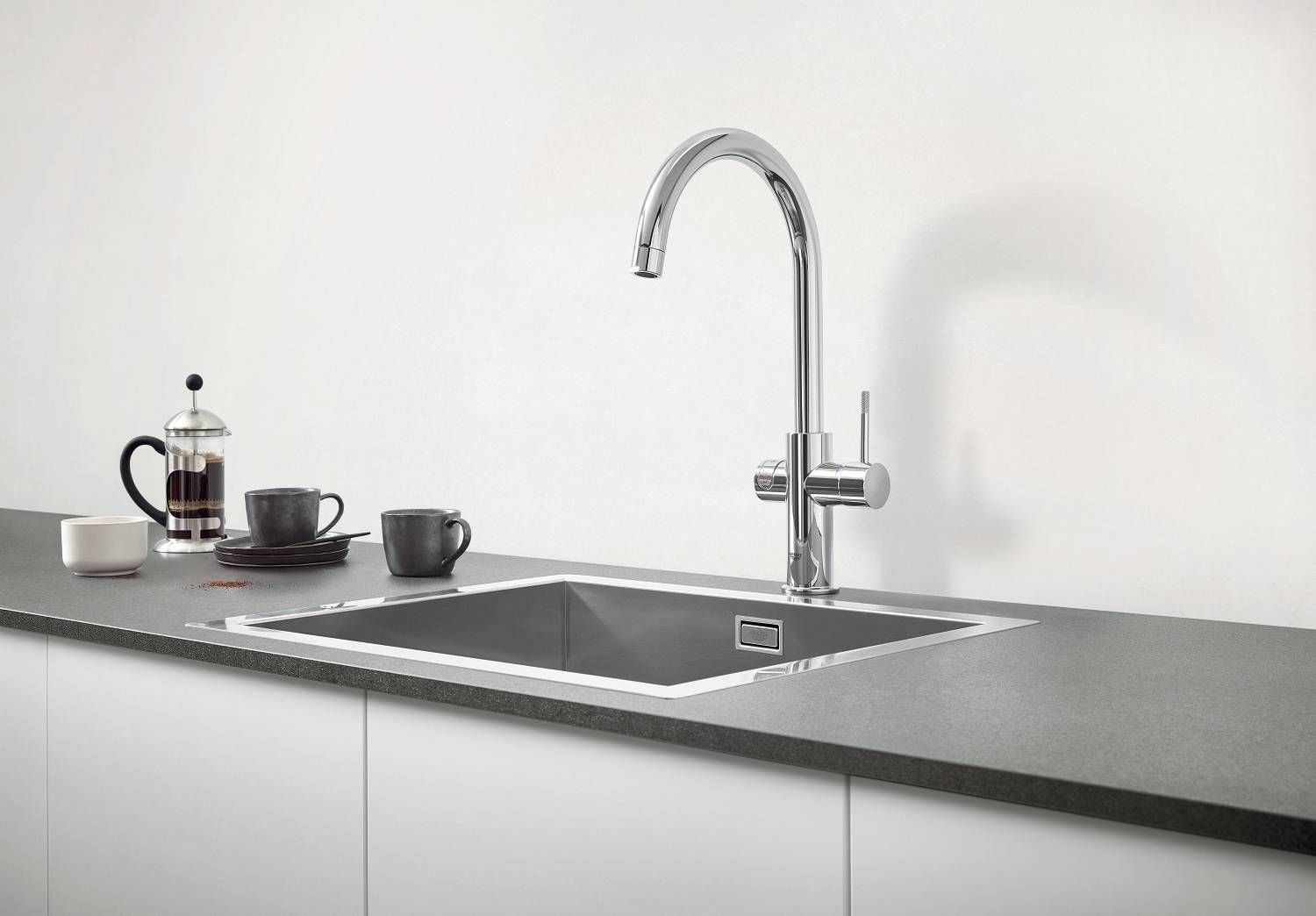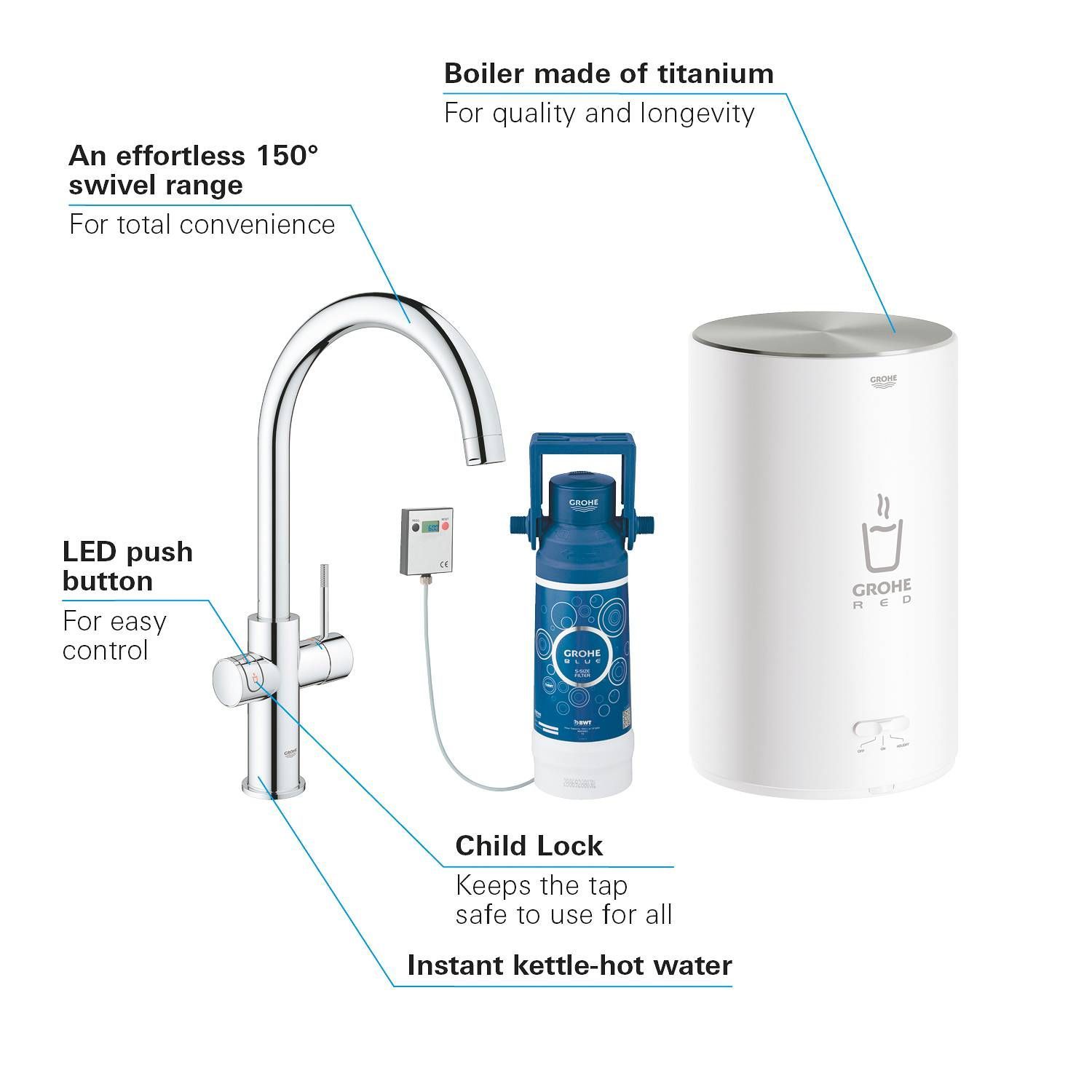GROHE ChildLock кнопка для безопасного открывания кипящей воды.
