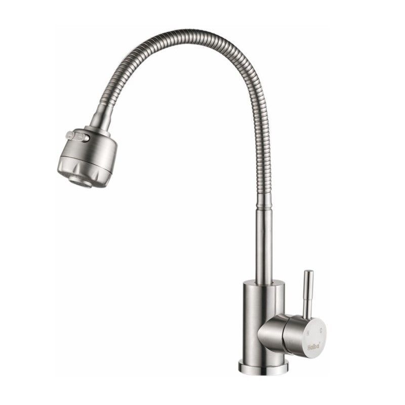 Смеситель для кухни бренда Haiba. Изготовлен из нержавеющей стали. Картридж 35 мм. Укомплектован аэратором. Гибкая подводка 40 см. С поворотным изливом.