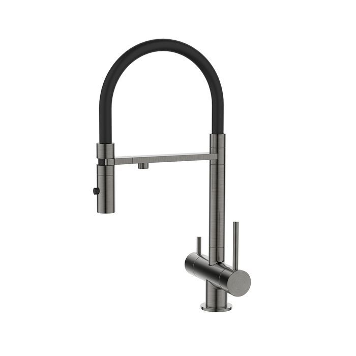Контрастный излив делает смеситель Ace в графитовом цвете таким привлекательным. Функциональная модель помогает эффективнее справляться с повседневными задачами на современной кухне. Отдельный канал для фильтрованной воды дает доступ к чистой питьевой воде прямо из-под крана. Гибкий излив позволяет направить струю воды в нужную точку кухонной мойки. При этом руки остаются свободными благодаря держателю для излива на корпусе. Магнитный замок надежно фиксирует излив после использования.