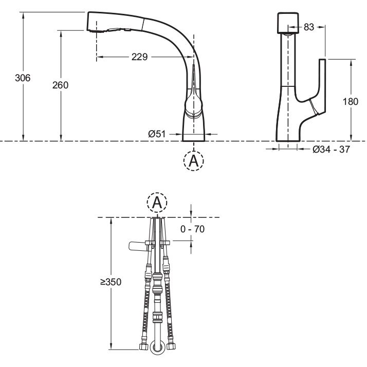 - Мультифункциональный излив: поворотный, выдвижной, L 22,9 см.