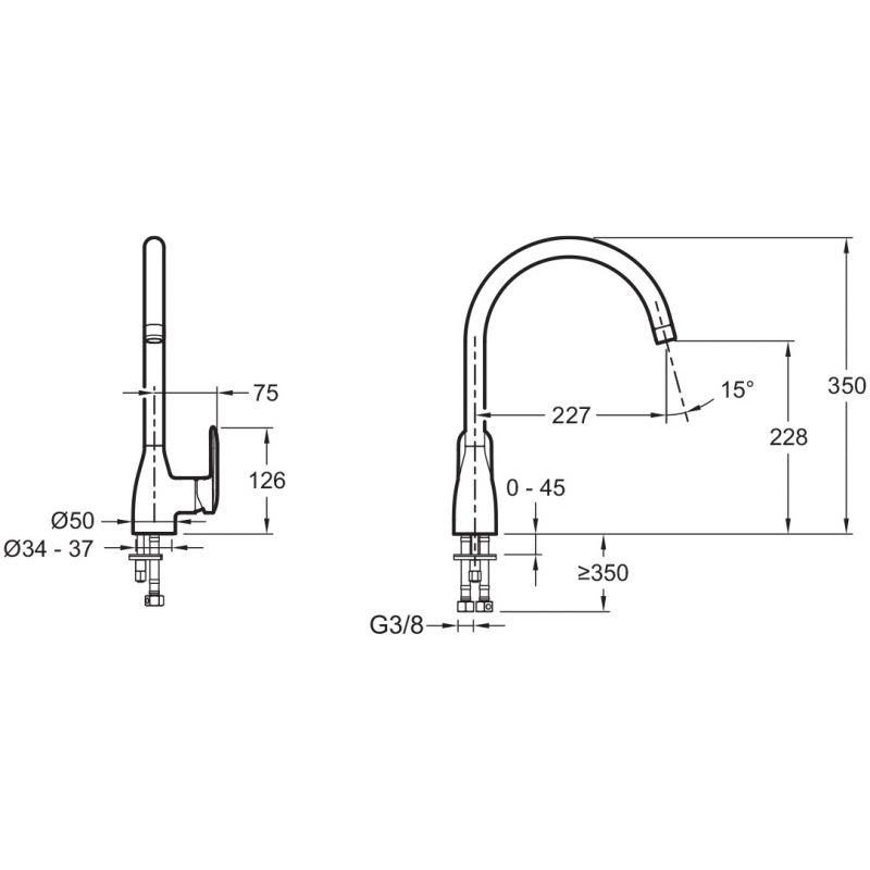 Поворотный излив: 360 градусов, L 22,7 см.