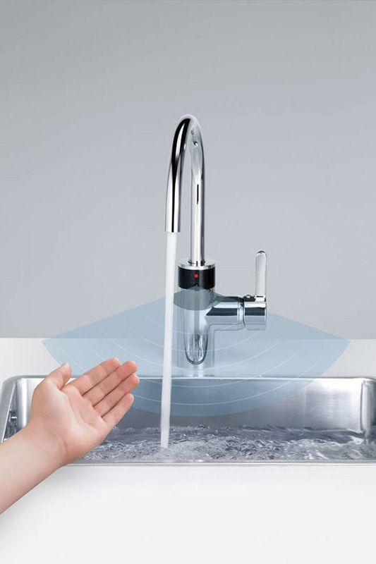 - Сенсорное управление позволяет включать воду, не касаясь смесителя.