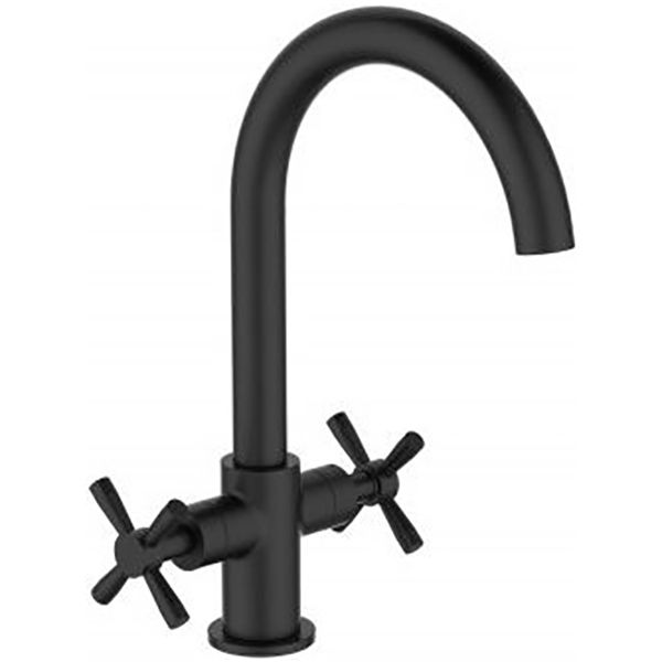 Смеситель с поворотным изливом в черном цвете, крепится на сантехнику, идеально подходит для любых кухонных комнат в современном стиле. Качественные материалы, которые используются для производства, устойчивы к коррозии и перепадам температур. Керамическая кран-букса позволит Вам плавно регулировать поток воды и температуру, это достаточно удобно в повседневном использовании.
