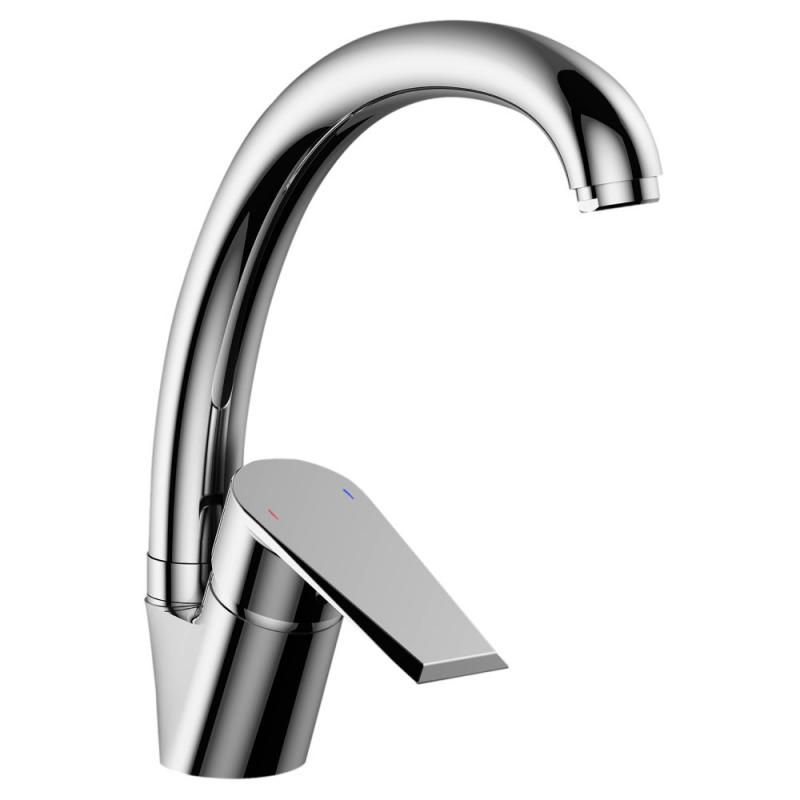 Смеситель для кухни Rossinka RS28-23 с поворотным изливом. Пластиковый аэратор с функцией легкой очистки, керамический картридж 35 мм, гибкая подводка 40 см - 2 шт., присоединительная группа для горизонтального крепления, металлическая рукоятка