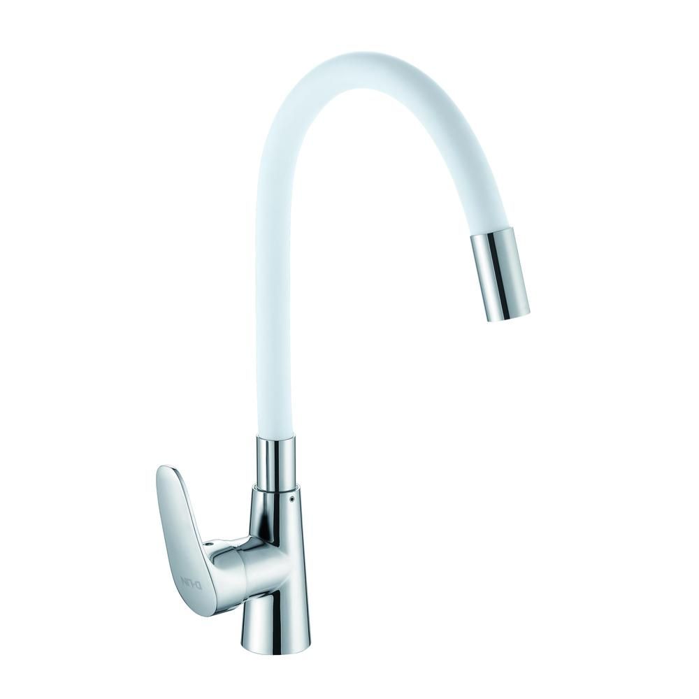 Смеситель для кухни с гибким изливом D-Lin D155302-3, хром/белый. Управление: рычажное. Материал: металлический сплав. Монтаж: на мойку.