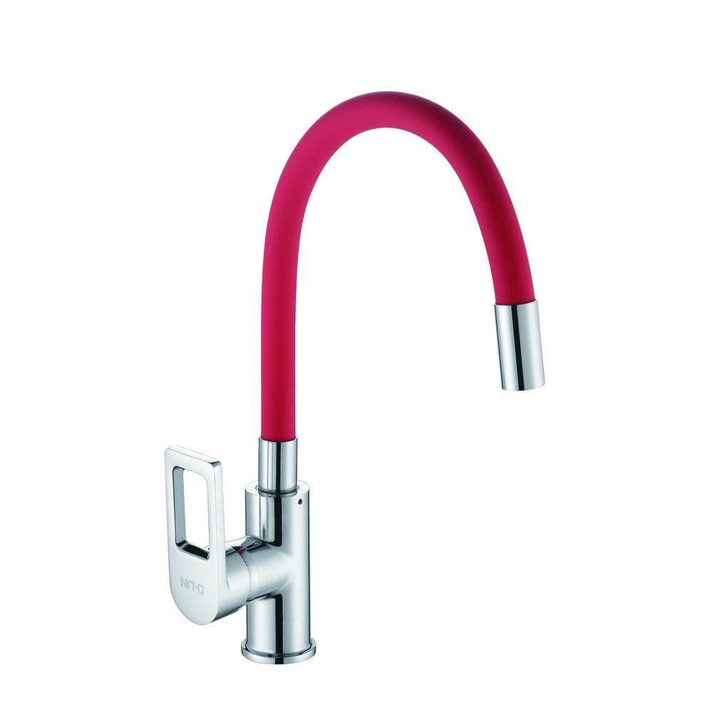Смеситель для кухни с гибким изливом D-Lin D155308-4, хром/красный. Управление: рычажное. Материал: латунь. Монтаж: на мойку.