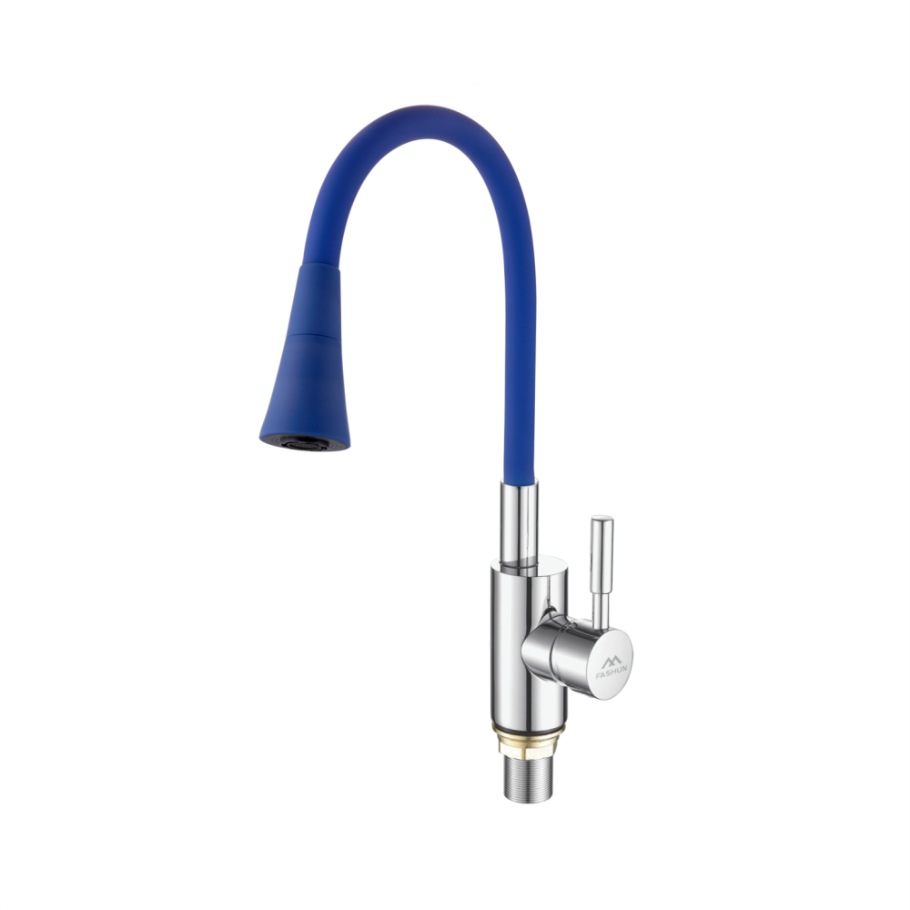 Смеситель для кухни с гибким изливом FASHUN A4053+B11, хром/синий. Управление: рычажное. Вращение излива: да. Выдвижной излив: нет. Гибкий излив: да. Высота: 40,1 см.