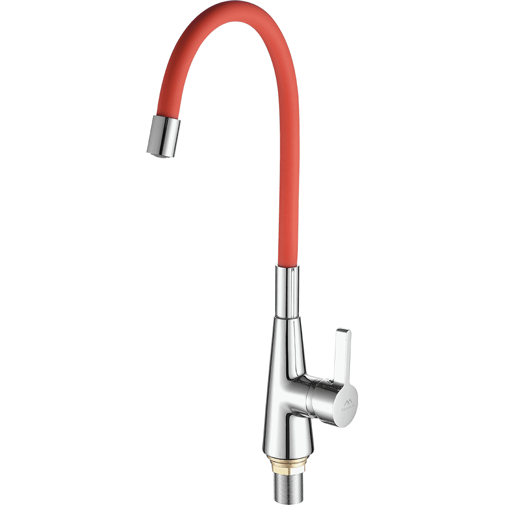 Смеситель для кухни с гибким изливом FASHUN A4153+B06, хром/красный. Управление: рычажное. Вращение излива: да. Выдвижной излив: нет. Гибкий излив: да. Высота: 44,6 см.