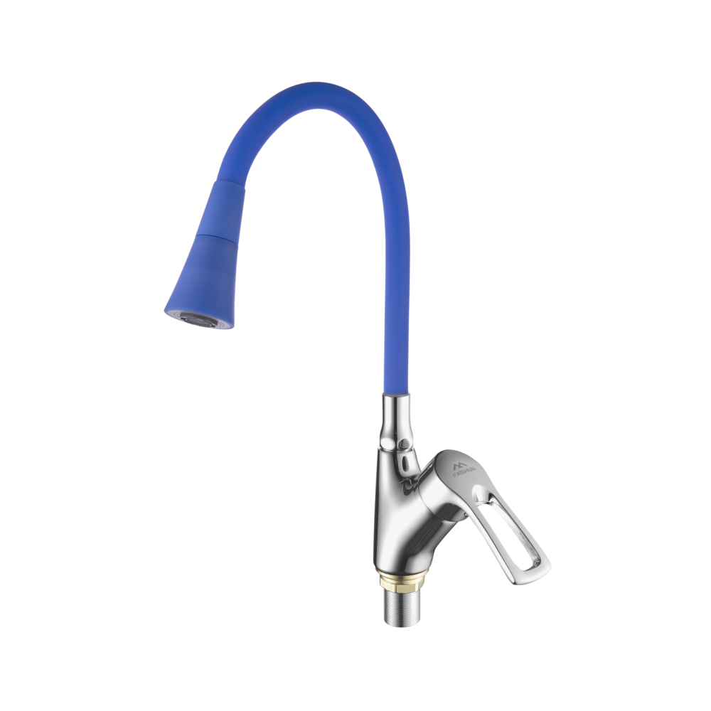 Смеситель для кухни с гибким изливом FASHUN A4466+A7351, хром/синий. Управление: рычажное. Вращение излива: да. Выдвижной излив: нет. Гибкий излив: да. Высота: 39,3 см.