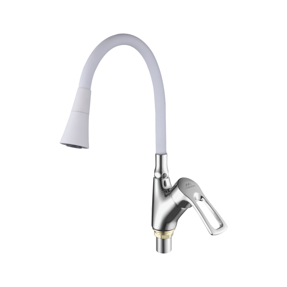 Смеситель для кухни с гибким изливом FASHUN A4466+A7356, хром/белый. Управление: рычажное. Вращение излива: да. Выдвижной излив: нет. Гибкий излив: да. Высота: 39,3 см.