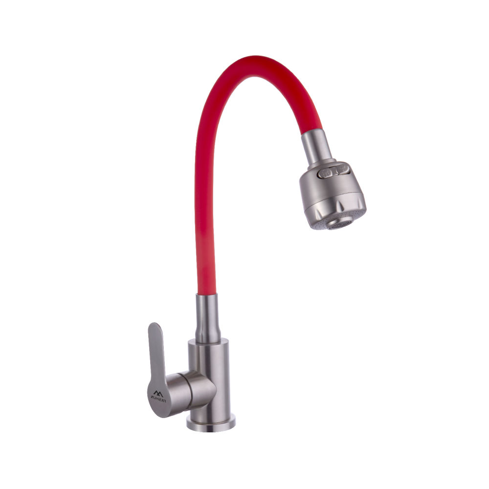 Смеситель для кухни с гибким изливом FASHUN A54101+N7348, сатин/красный. Управление: рычажное. Вращение излива: да. Выдвижной излив: нет. Гибкий излив: да. Высота: 32,8 см.