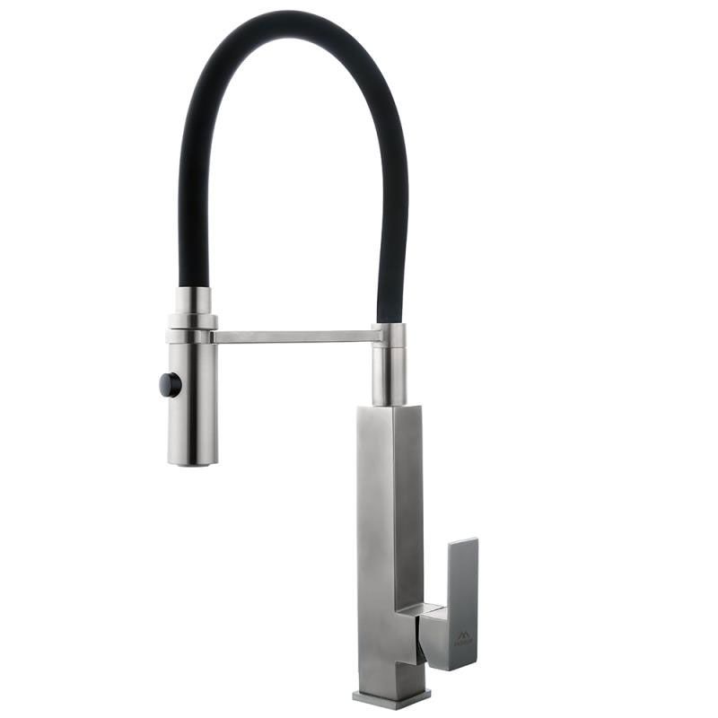 Смеситель для кухни с гибким изливом FASHUN A54102-7, сатин/черный. Управление: рычажное. Вращение излива: да. Выдвижной излив: нет. Гибкий излив: да. Высота: 55 см.