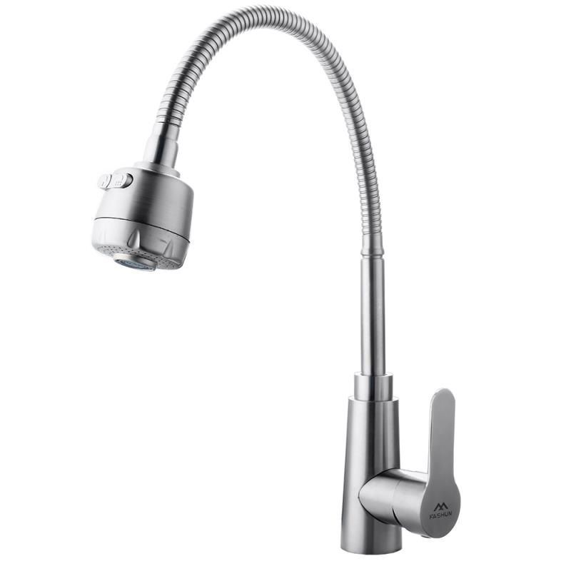 Смеситель для кухни с гибким изливом FASHUN A54301-3, сатин. Управление: рычажное. Вращение излива: да. Выдвижной излив: нет. Гибкий излив: да. Высота: 35 см.