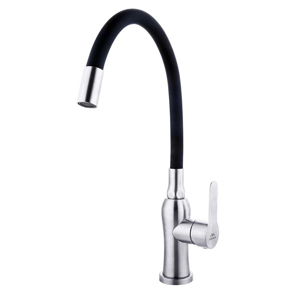 Смеситель для кухни с гибким изливом FASHUN A54801-7, сатин/черный. Управление: рычажное. Вращение излива: да. Выдвижной излив: нет. Гибкий излив: да. Высота: 37,5 см.