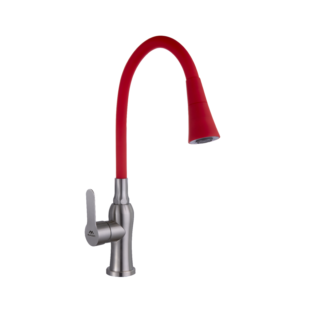 Смеситель для кухни с гибким изливом FASHUN A54801+N7358, сатин/красный. Управление: рычажное. Вращение излива: да. Выдвижной излив: нет. Гибкий излив: да. Высота: 42,5 см.