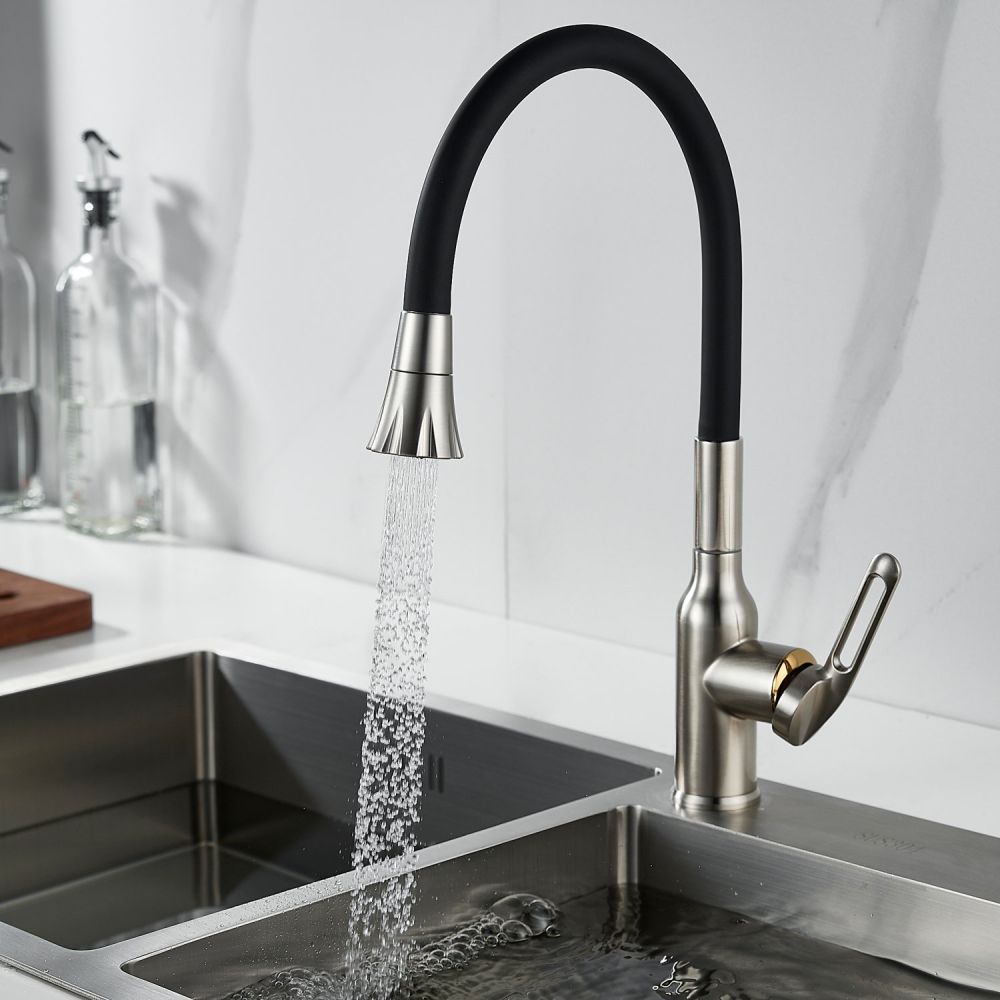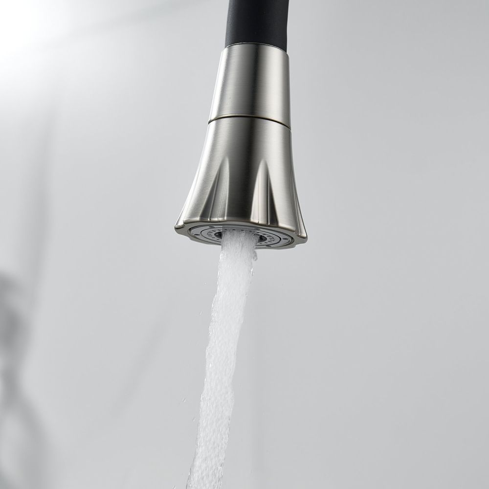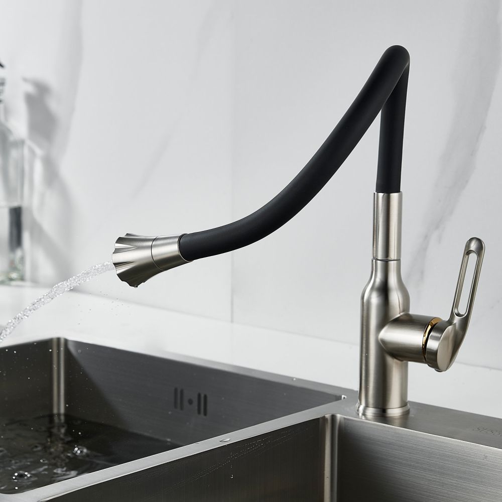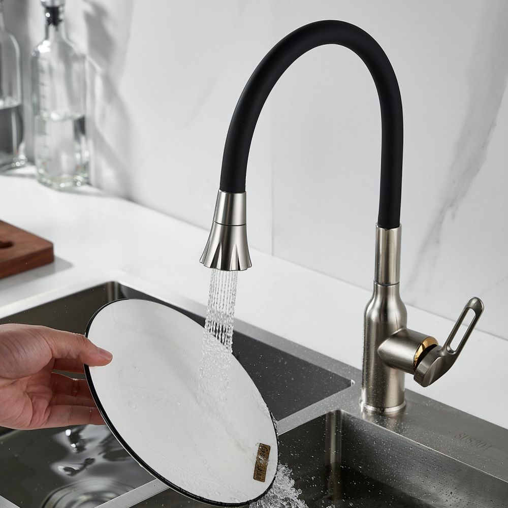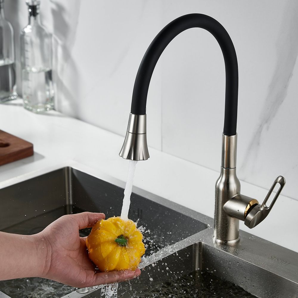 Одной из ключевых особенностей этого смесителя является его высокий поворотный излив, который обеспечивает удобство при наполнении больших кастрюль или ваз водой. Благодаря гибкому силиконовому изливу с двумя режимами работы (стандартный и “душ”), вы можете легко переключаться между струей и душем для мытья посуды или продуктов.