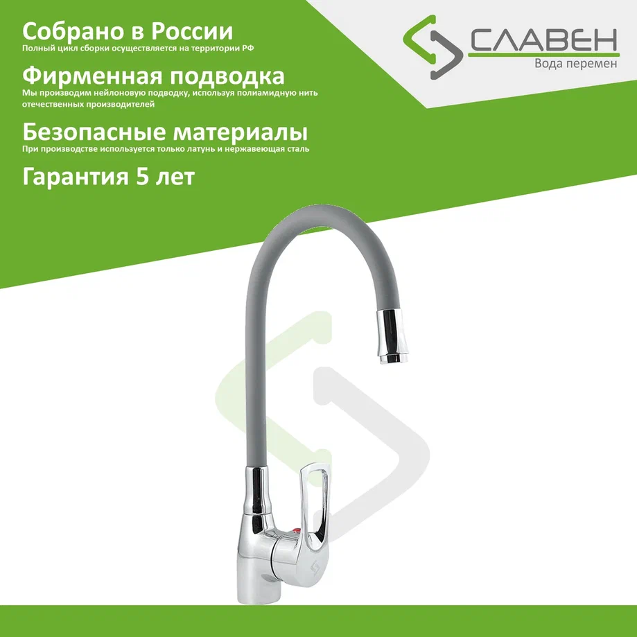 Современный однорычажный смеситель для кухни с высоким поворотным изливом от компании «СЛАВЕН» c собственной сборочной линией полного цикла в Подмосковье.