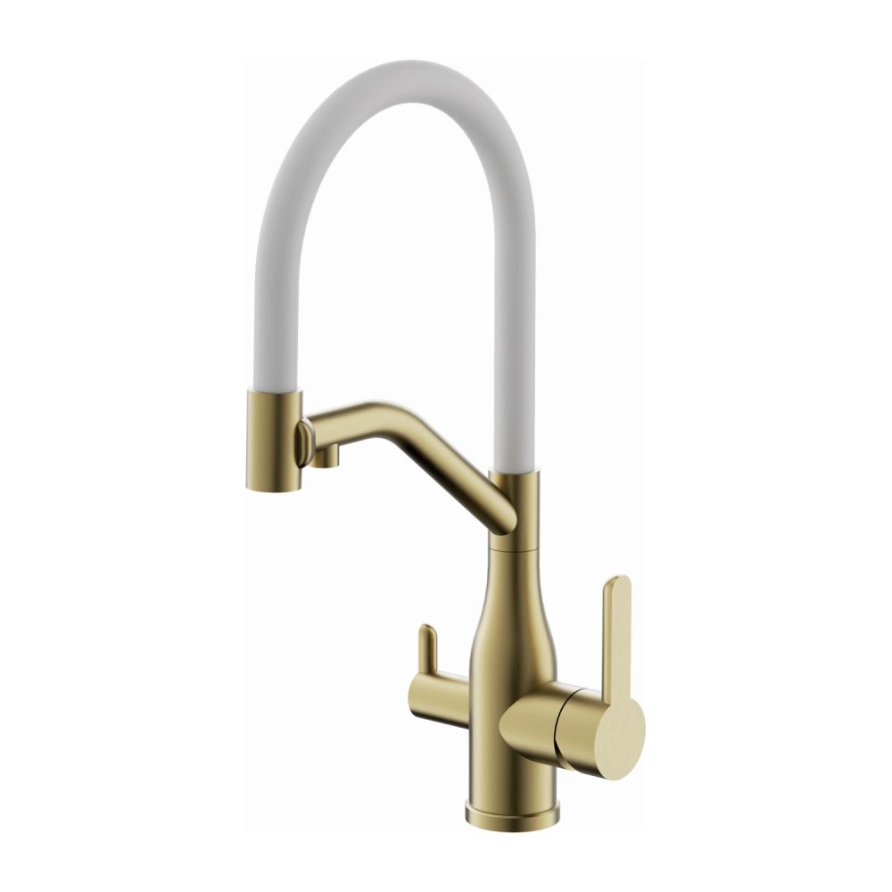Поворотный излив для подачи фильтрованной воды. Это решение позволяет получать чистую и безопасную воду прямо из смесителя, что особенно важно для приготовления пищи и напитков.