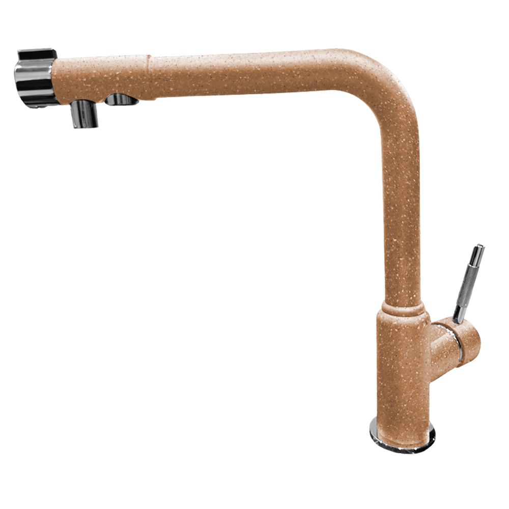 Смеситель для кухни с подключением фильтра GranFest 7671, терракот. Материал: латунь. Управление: рычажное. Подключение фильтра для воды: да. Гибкая подводка. Отверстия для монтажа: 1.