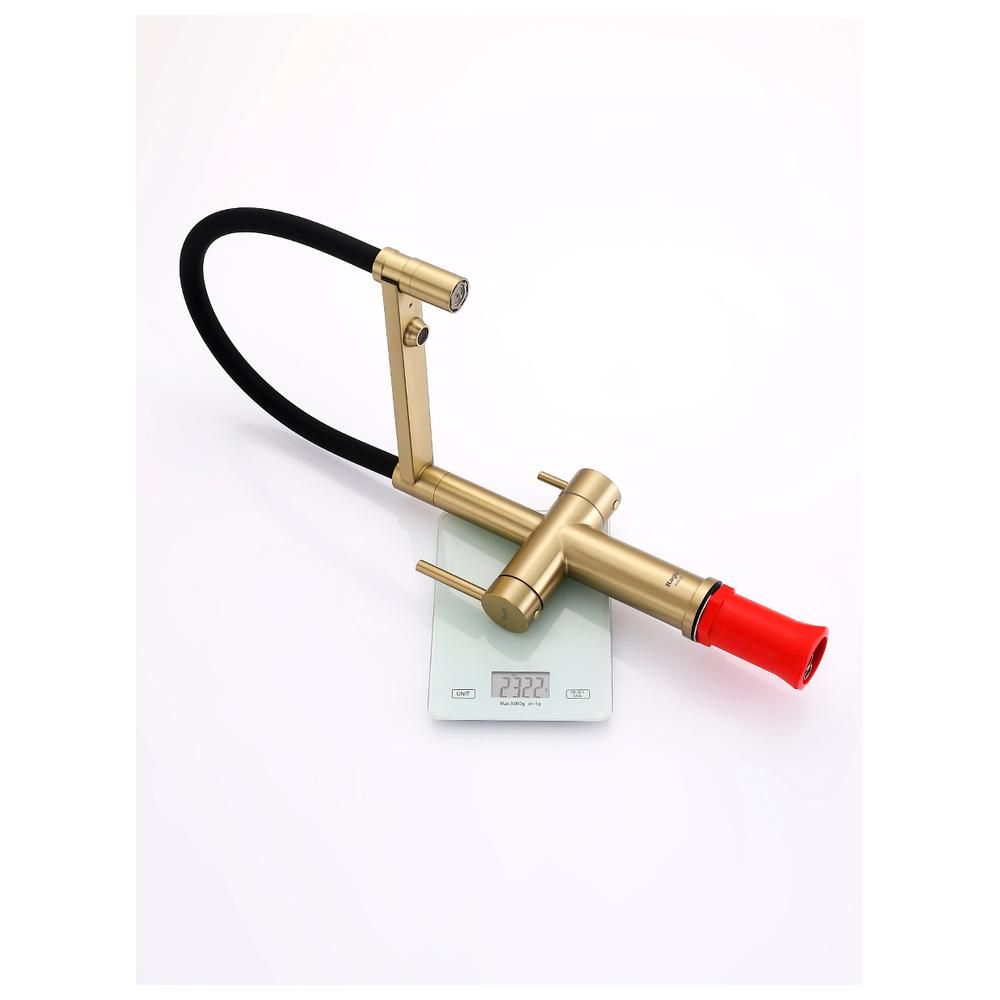Дополнительный излив служит не только для подачи фильтрованной воды, но и как держатель для гибкого излива, когда тот не используется, что добавляет удобства в повседневном использовании.