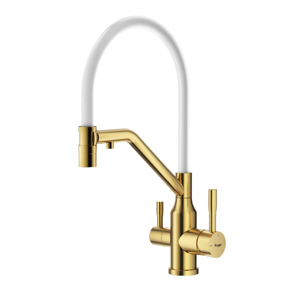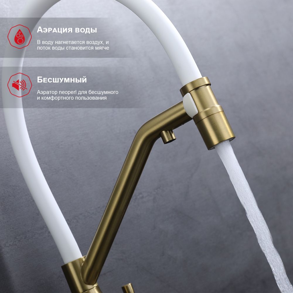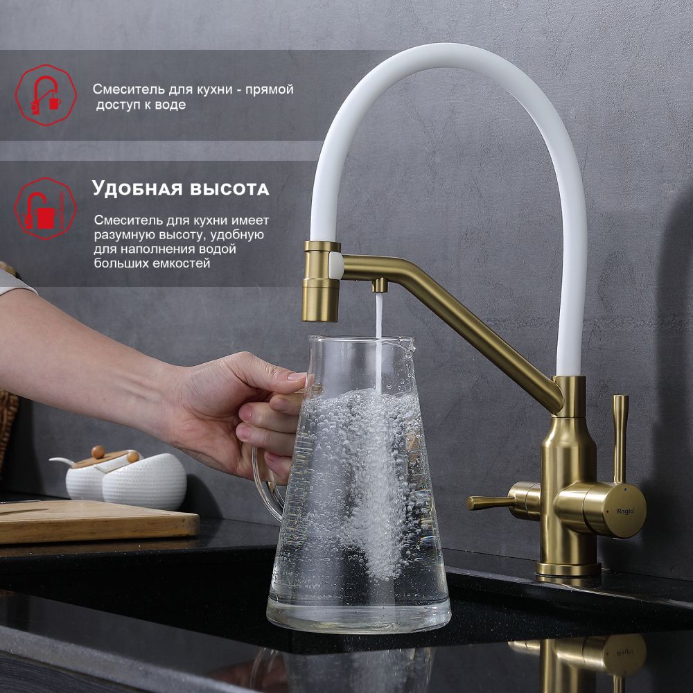 Raglo R81.62.03. Цвет: сатин золотой. Смеситель для кухни со съемным изливом на магните и подключением фильтра питьевой воды. Гибкий излив белого цвета. Крепление на усиленной гайке. Подводка длиной 55 см имеет латунные гайки. Гарантия на смеситель 7 лет и 2 года на покрытие!