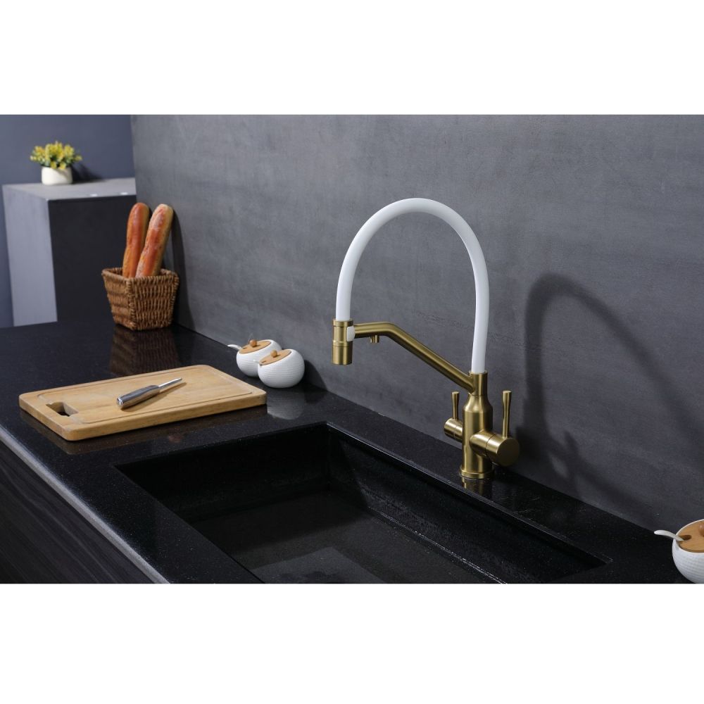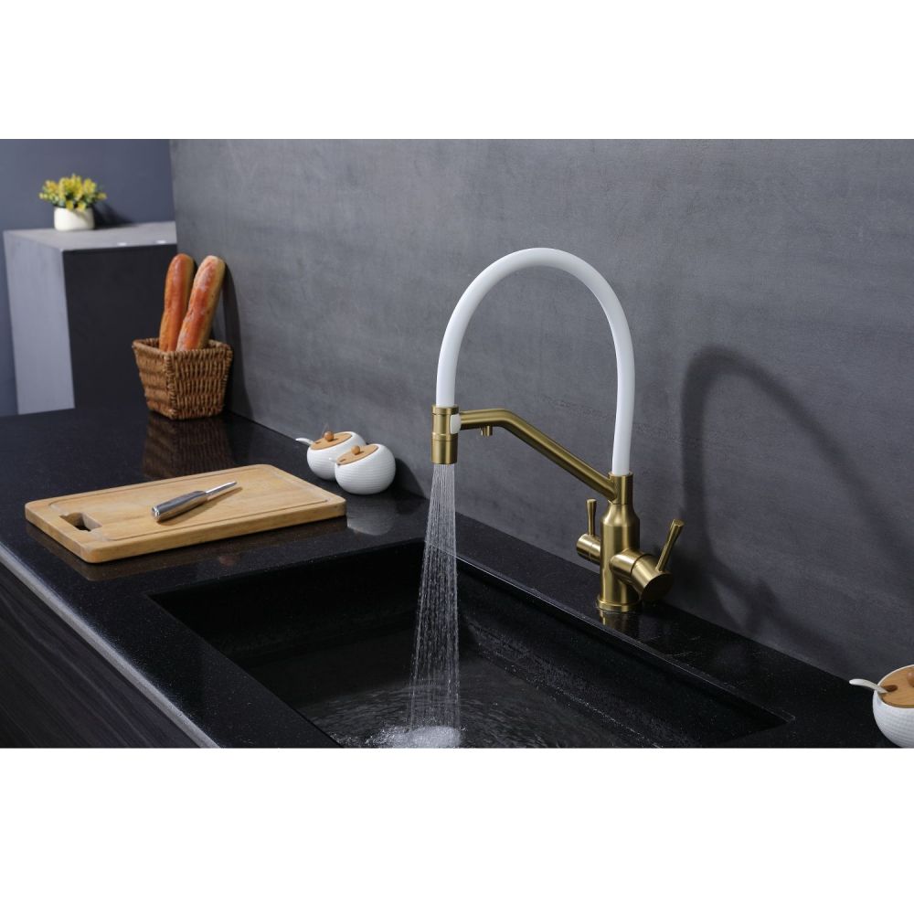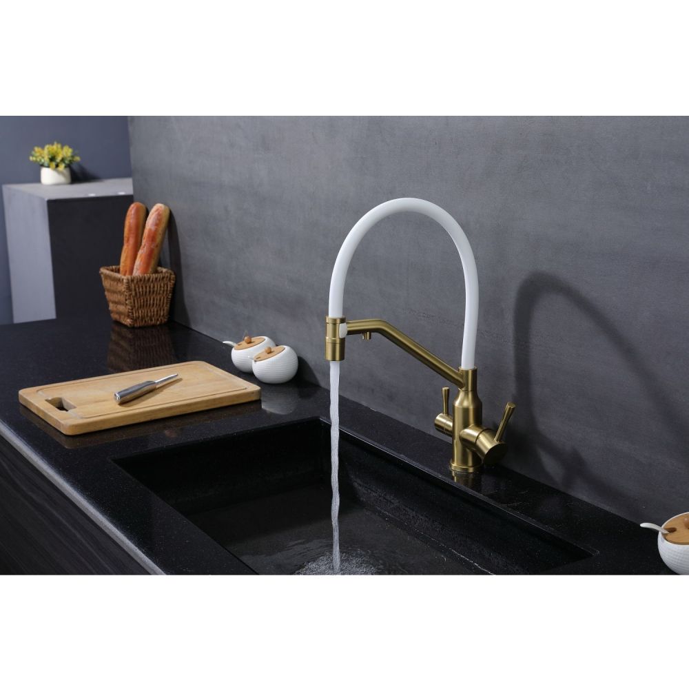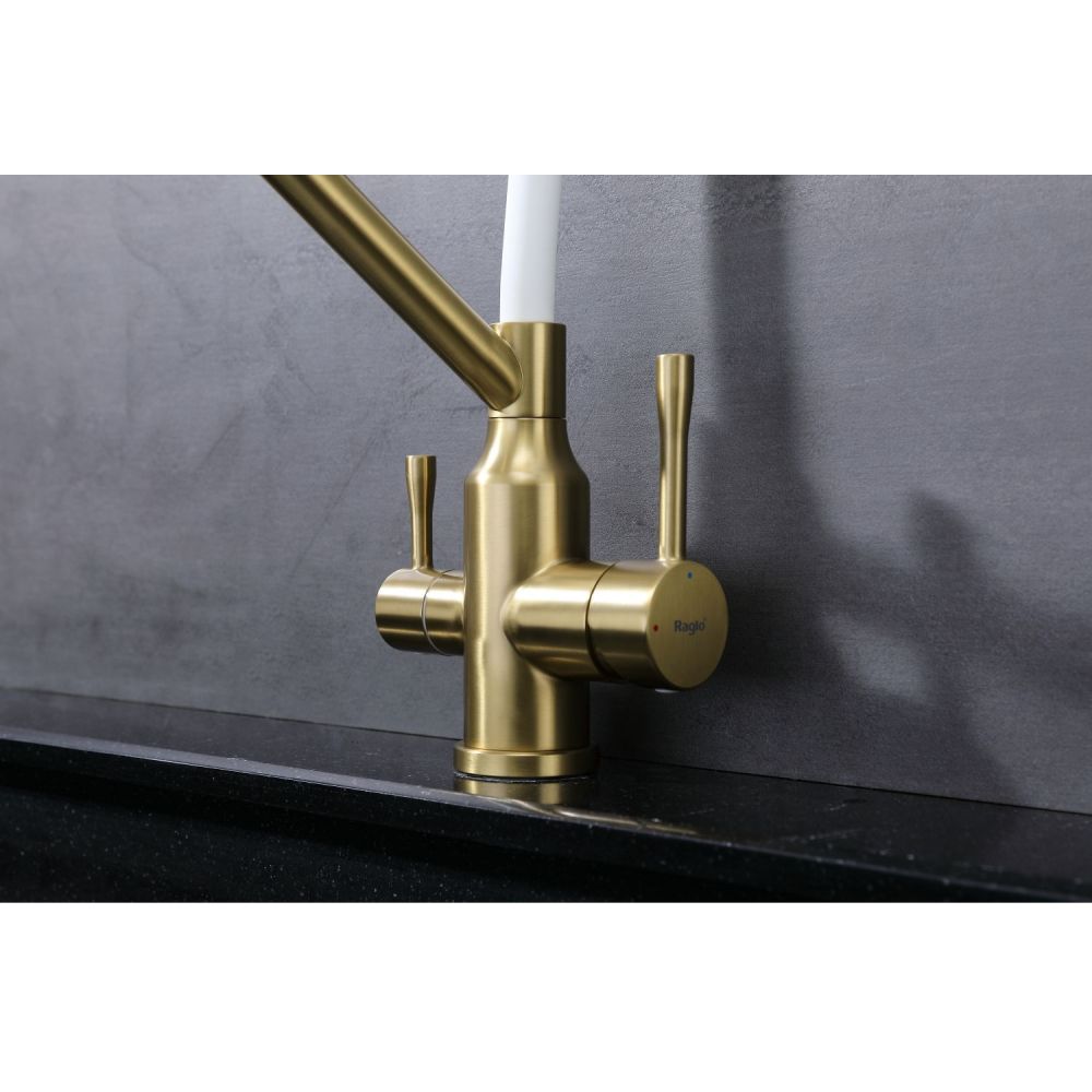 Raglo R81.62.03. Цвет: сатин золотой. Смеситель для кухни со съемным изливом на магните и подключением фильтра питьевой воды. Гибкий излив белого цвета. Крепление на усиленной гайке. Подводка длиной 55 см имеет латунные гайки. Гарантия на смеситель 7 лет и 2 года на покрытие!