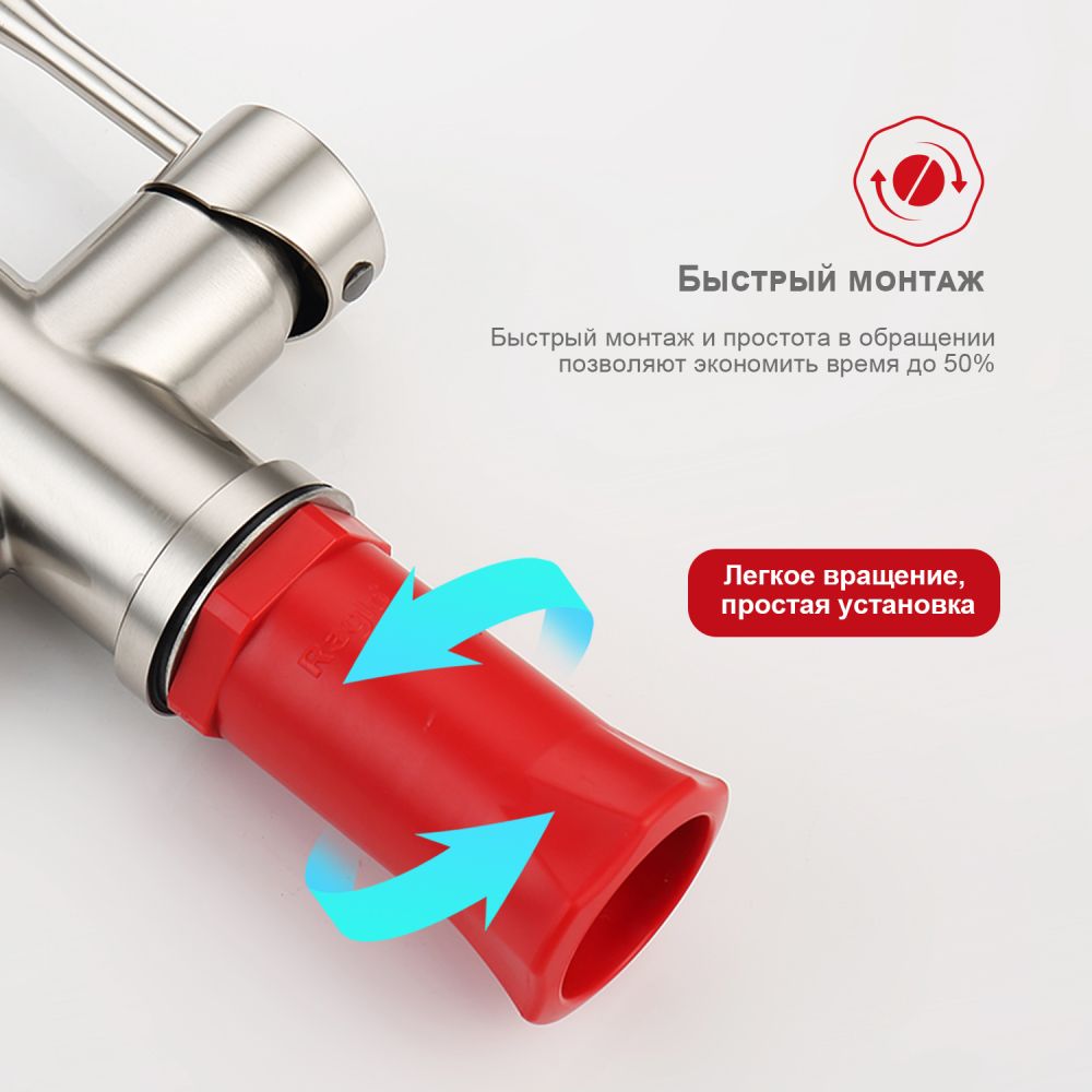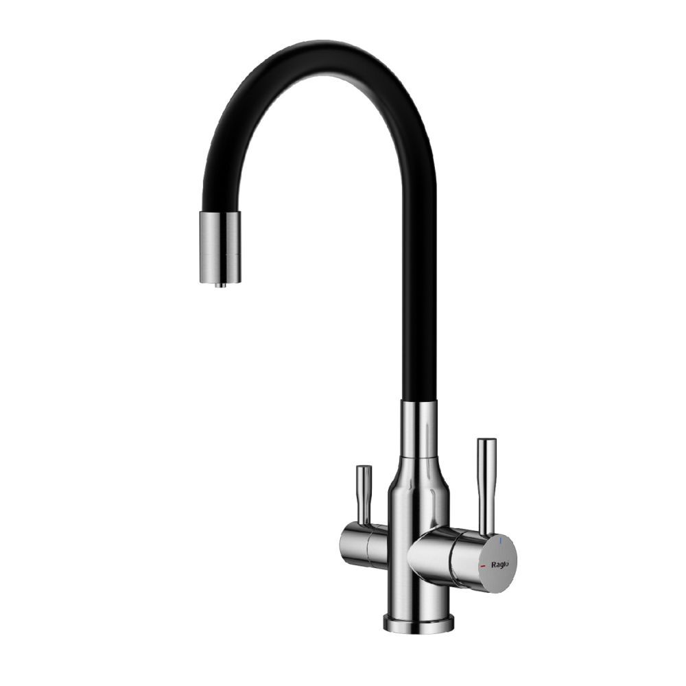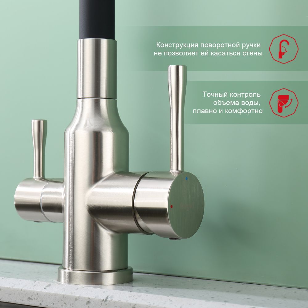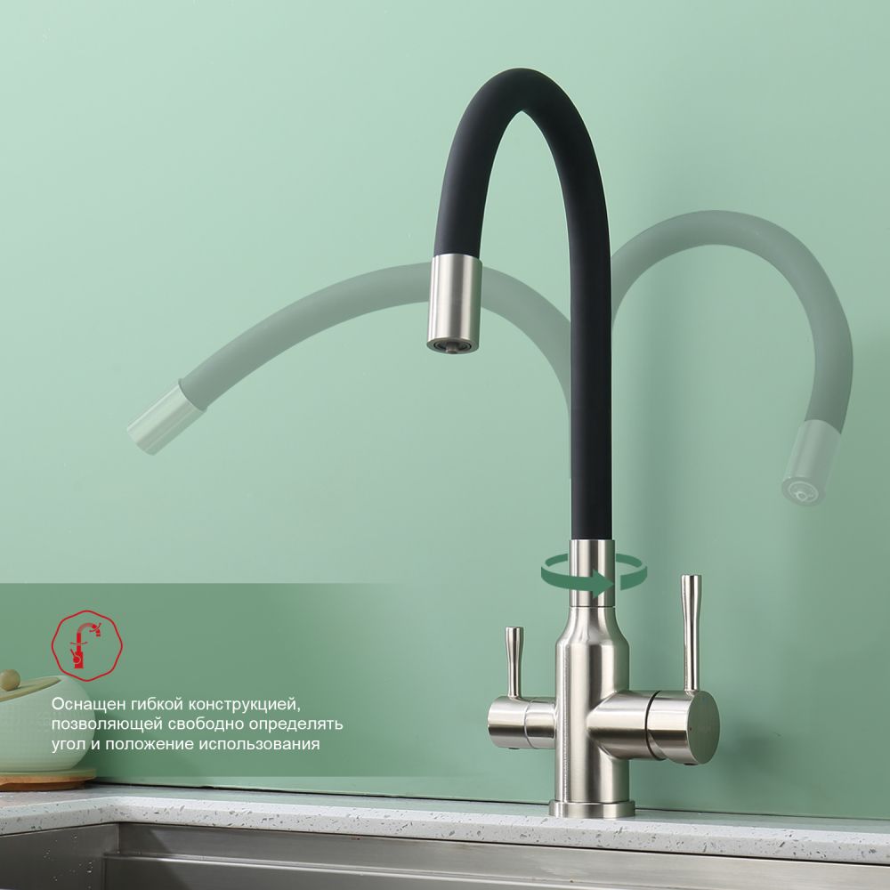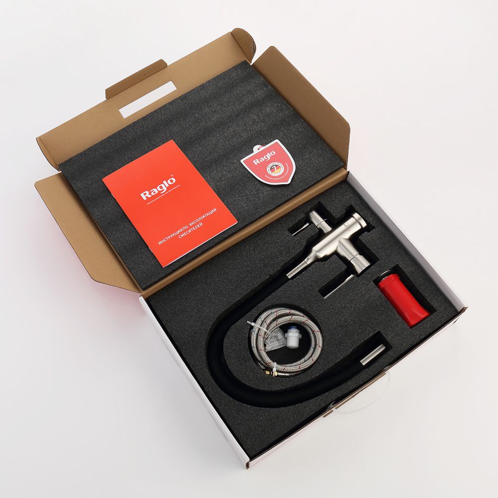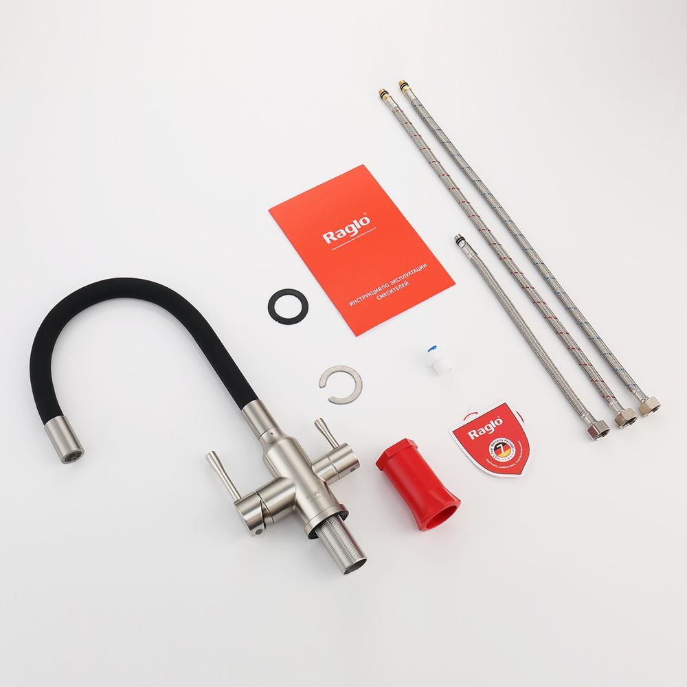 Raglo R81.64.05. Цвет: сатин. Смеситель для кухни с подключением к фильтру питьевой воды. Гибкий излив черного цвета. Крепление на усиленной гайке. Подводка длиной 55 см имеет латунные гайки. Гарантия на смеситель 7 лет и 2 года на покрытие!