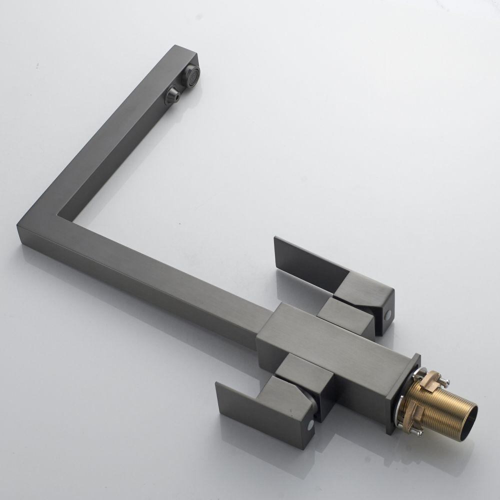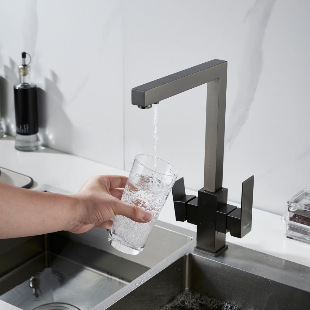 Особенность модели — функция подключения системы фильтрации питьевой воды. Смеситель оснащён двойным изливом: один подаёт обычную водопроводную воду, прошедшую через аэратор для мягкого, равномерного потока без брызг, а второй — отдельный канал — подаёт чистую, очищенную питьевую воду прямо из фильтра. Это значит, что вы можете одним движением переключаться между водой для мытья посуды и водой, пригодной для питья и приготовления чая или кофе, без необходимости использовать отдельные кувшины или насадки.