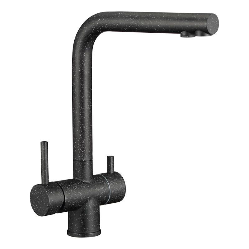 Fmark FS1362H-1 — это функциональный кухонный смеситель с независимой подачей водопроводной и фильтрованной воды, выполненный в стильном черном цвете. Корпус и излив покрыты декоративным композитным слоем с мелкими вкраплениями, который гармонирует с гранитными мойками и рабочими поверхностями в природных оттенках.