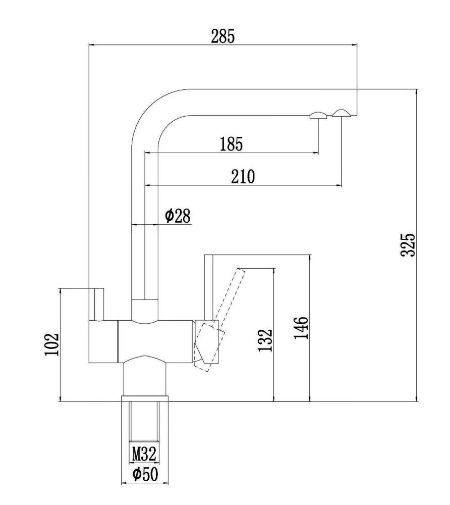 Прямой излив с углом 90° обеспечивает удобную подачу воды в центр мойки, подчёркивая строгую геометрию изделия.