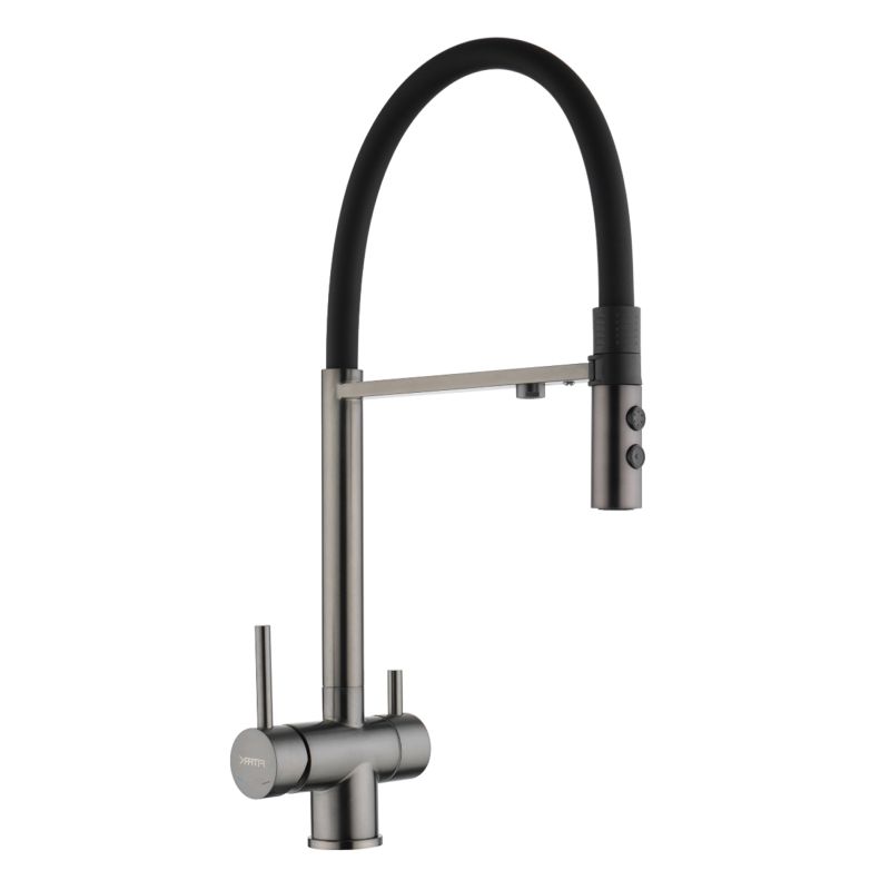 Смеситель для кухни с подключением к фильтру и режимом "душ" Fmark FS1262-Q01, графит. Гарантийный срок: 5 лет. Поверхность: матовая. Материал: нержавеющая сталь. Монтаж: на мойку, на столешницу.