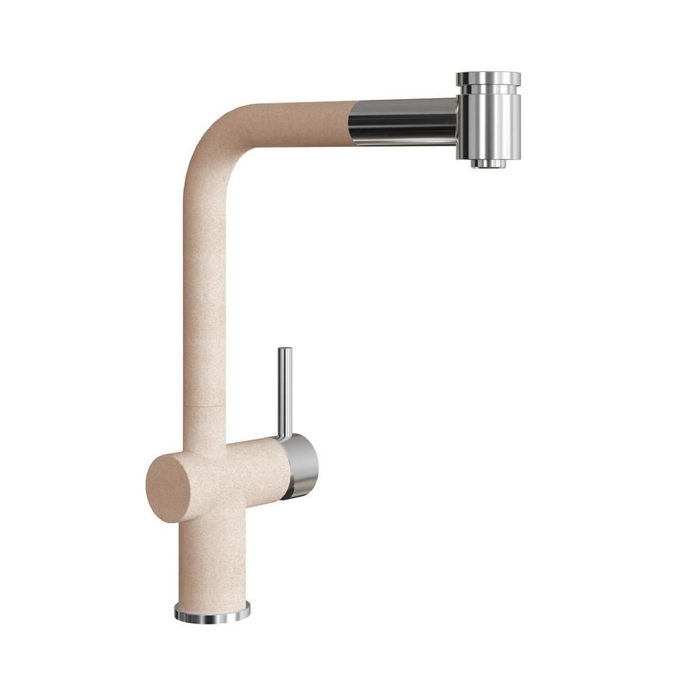 Смеситель однорычажный с выдвижным изливом. Материал – нержавеющая сталь AISI 304. Поворотный излив. Керамический картридж 35мм. Гибкая подводка. Два режима напора воды – душ/струя.