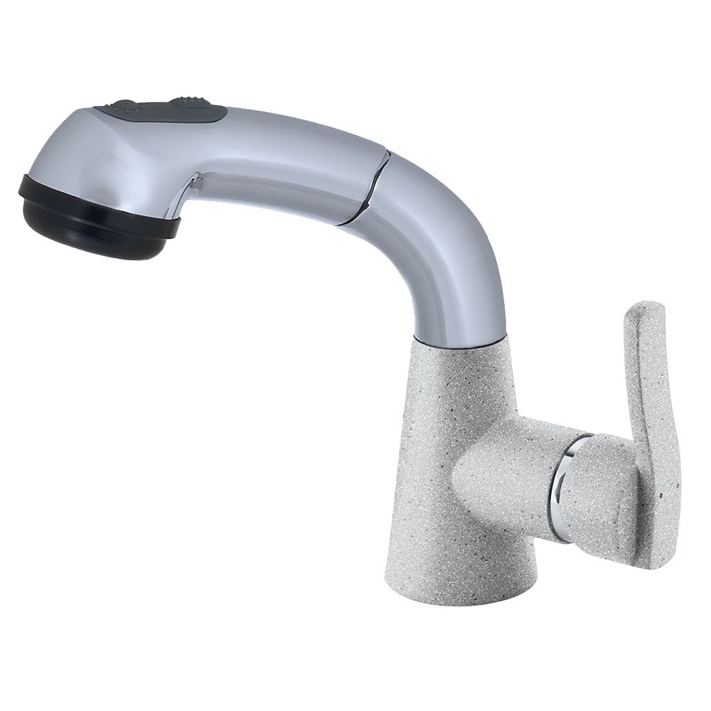 Смеситель для кухни с выдвижным изливом и режимом душ GranFest 3773, серый металлик. Материал: латунь. Управление: рычажное. Подключение фильтра для воды: нет. Гибкая подводка. Отверстия для монтажа: 1.
